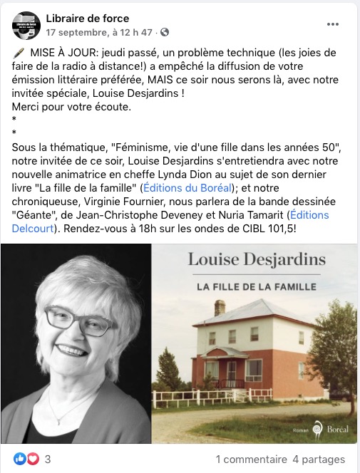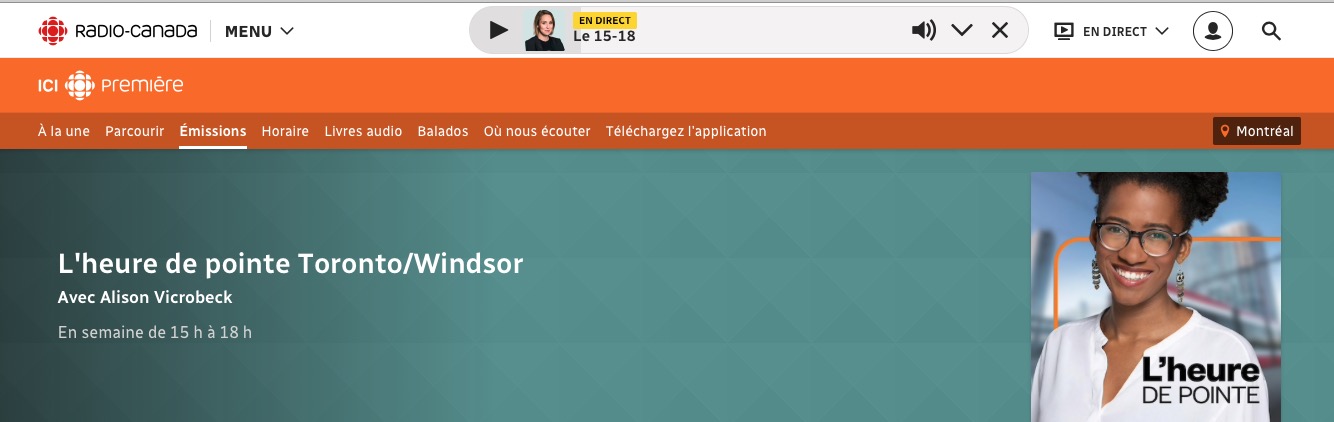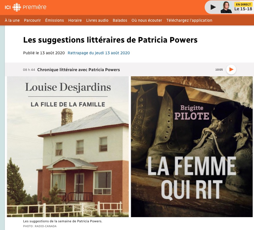 L'heure de pointe Toronto/Windsor avec Alison Vicrobeck, Radio-Canada, Ici Première: Louise Desjardins parle de son roman «La fille de la famille», extraits
